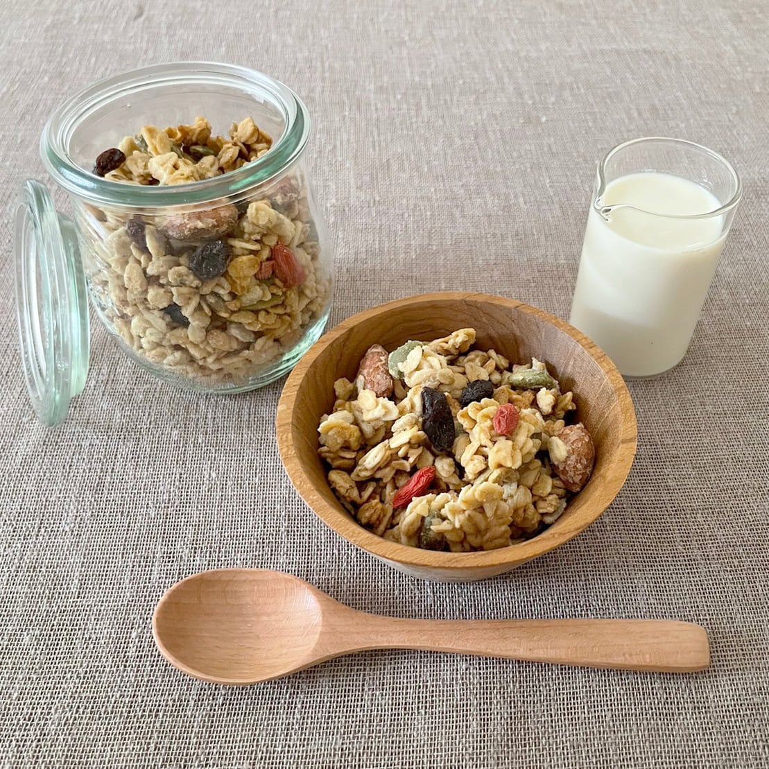 有機オートミール(アメリカ製造)、有機メープルシロップ、有機ココナッツオイル、米麹、米粉、アーモンド、有機レーズン、有機ひまわりの種、かぼちゃの種、米、クコの実、塩、シナモン